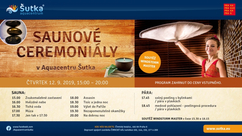 Připomeňte si teplo léta a užijte si saunové ceremoniály v Aquacentru Šutka, a to ve čtvrtek 12. 9. 2019 v Aquacentru Šutka. Profesionální saunéři pomocí víření horkého vzduchu, polévání kamenů aromatickou přírodní esencí a dalším procedurám vám představí novou dimenzi saunování. Pro milovníky saunování budou připraveny různé typy saunových ceremoniálů na témata, jako jsou Hvězdné nebe, Tichá voda, Tisíc a jedna noc nebo Výlet do Paříže. V 15:30 a 18:15 se všichni odvážlivci budou moci předvést a vyzkoušet svou sílu v rámci soutěže Windstorm Master – soutěže o nejsilnější mávnutí ručníkem o volné vstupy do Aquacentra. V páře se můžete nechat hýčkat beauty procedurou s využitím solného a medového peelingu.